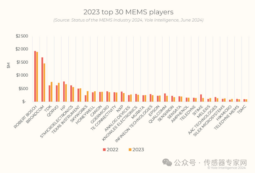 從全球MEMS廠商TOP 30名單來看,來自美國的廠商有Broadcom(博通)、Qorvo、Hewlett Packard(惠普)、Texas Instruments(德州儀器)、Skyworks、Honeywell(霍尼韋爾)、Analog Devices(ADI)、Knowles Electronics(樓氏電子)、Qualcomm(高通)、Sensata(森薩塔)、Amphenol(安費諾)、Teledyne(FLIR,MEMS)、Si Time等,占據榜單的近一半。