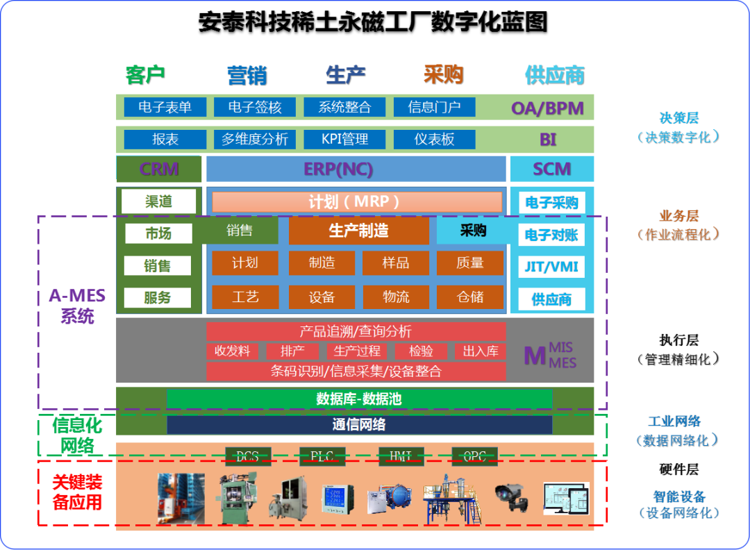 該項目通過建設統一的設備工業網絡實現設備的實時數據采集,結合生產制造系統數據信息,串聯決策層、執行層以及設備層,打通數據壁壘。項目適合復雜工業流程、多品種、大批量的定制化稀土永磁行業制造工廠,推廣和復制性強,對國內稀土永磁行業其他工廠具有廣泛的借鑒意義。下一步,安泰科技將繼續完善信息管理平臺功能,增加產品數字化研發設計與可制造性設計方面的緊密聯動,實施制造資源量化,開發適合稀土永磁行業特色的計劃排程(APS),擴大智能協同作業場景。
