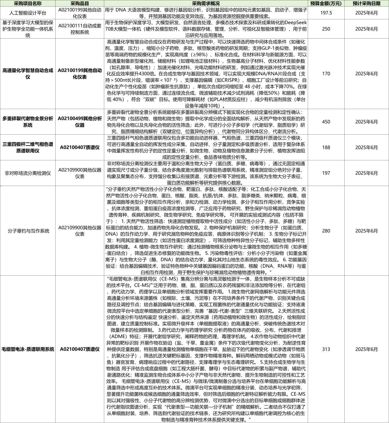 據中國政府采購網消息,近日,中科院成都生物研究所發布多個2025年4至12月政府采購意向,計劃采購時間均為2025年6月份。