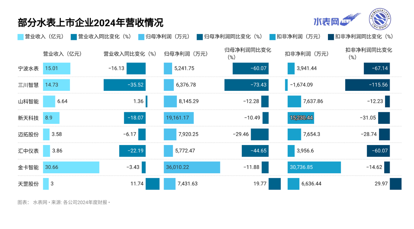 日前,多家水表上市企業(yè)發(fā)布2024年度財(cái)報(bào)。受宏觀經(jīng)濟(jì)波動、行業(yè)需求收縮及供應(yīng)鏈成本上升等多重挑戰(zhàn)影響,行業(yè)內(nèi)營收增長承壓,多家表企營業(yè)收入、凈利潤同比下滑。