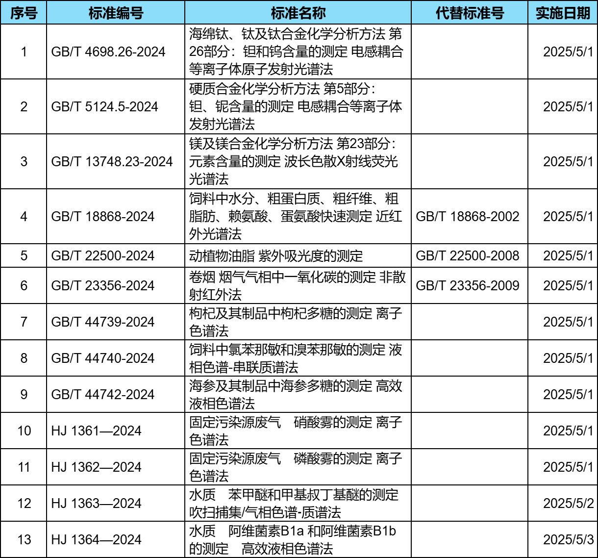 2025年5月1日,一批涉及色譜、質譜、光譜等分析測試方法的國家標準正式實施。這些標準廣泛應用于食品、化工、地質、環(huán)境等個領域,旨在進一步規(guī)范分析測試技術,提升行業(yè)檢測能力和科學性。