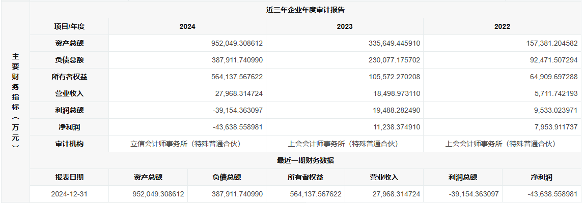 資產(chǎn)總額方面,2022年至2024年從15.74億元增長至95.2億元;負(fù)債總額從9.25億元增長至38.79億元;所有者權(quán)益從6.49億元增長至56.41億元。
