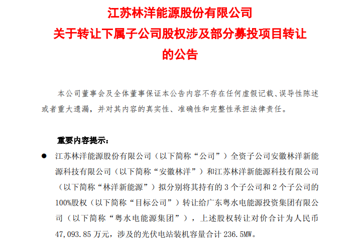 6月3日,林洋能源(601222)公告,公司全資子公司安徽林洋擬將其持有的濉溪縣永瑞現代農業科技有限公司、濉溪永暉新能源科技有限公司、阜陽永明農業太陽能發電有限公司3個子公司100%股權轉讓給粵水電能源集團;全資子公司林洋新能源擬將其持有的江蘇飛展能源科技有限公司和連云港林洋新能源有限公司2個子公司100%股權轉讓給粵水電能源集團,上述股權轉讓對價合計為人民幣47,093.85萬元,涉及的光伏電站裝機容量合計236.5MW,包括部分公司第二次非公開發行股票和公開發行可轉債募投項目。