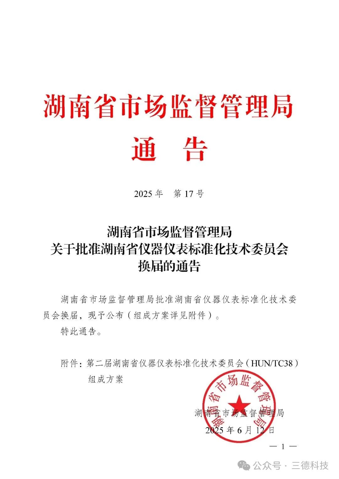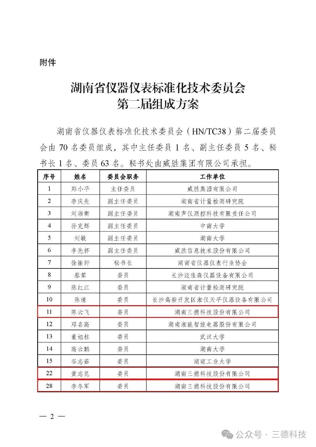 近日,湖南省市場監督管理局發布《關于批準湖南省儀器儀表標準化技術委員會換屆的通告》,正式公布第二屆委員會70人組成名單。三德科技技術專家陳云飛、黃志昆、李冬軍三人同時獲聘為委員,高度凸顯了我司在儀器儀表領域的技術影響力和標準化建設參與度。
