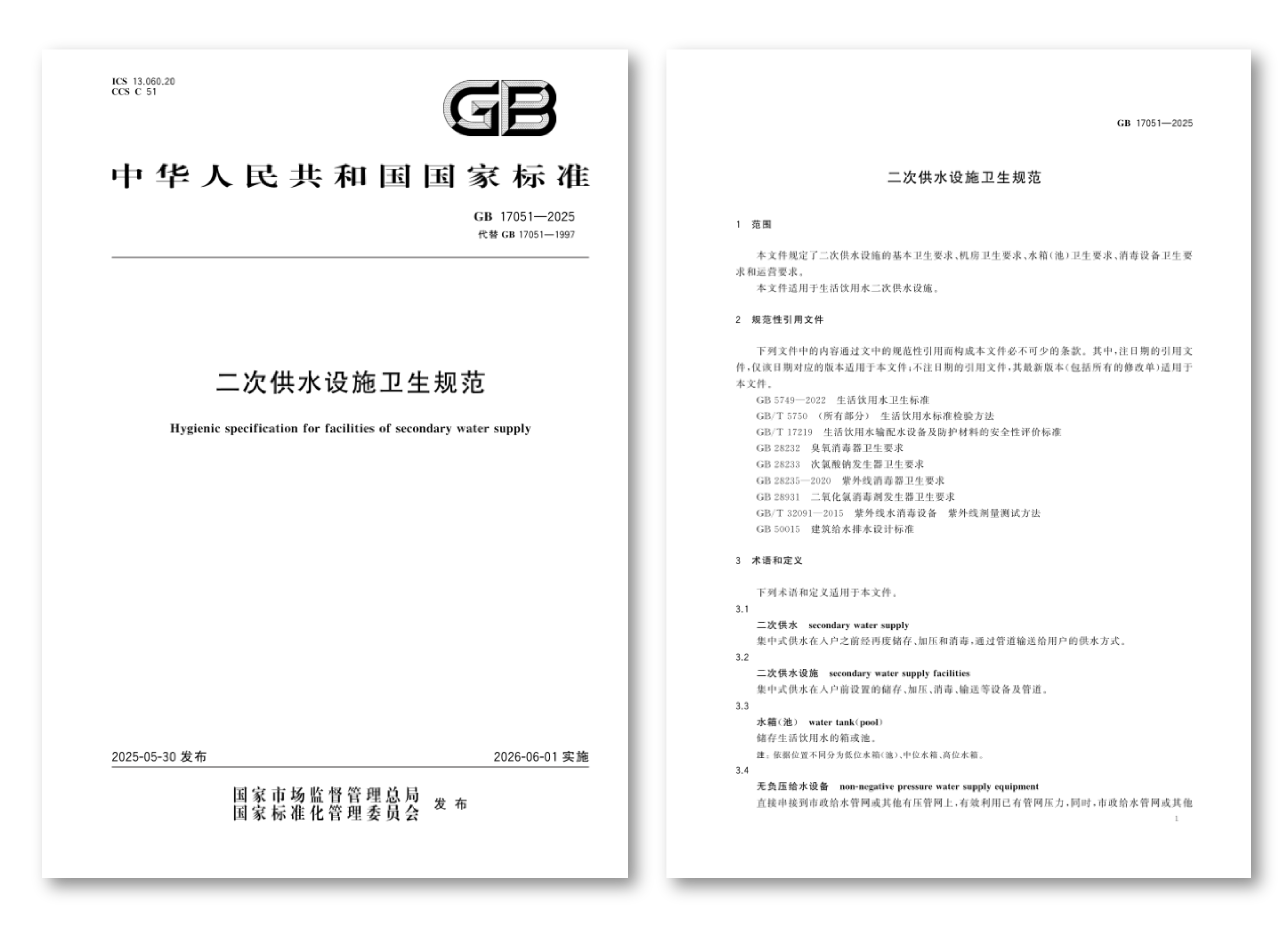 GB 17051-2025二次供水設施衛生規范,2025-05-30 發布,2026-06-01實施。此標準規定了二次供水設施的基本衛生要求、機房衛生要求、水箱(池)衛生要求、消毒設備衛生要求和運營要求。此標準適用于生活飲用水二次供水設施。