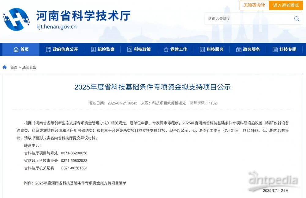 根據《河南省省級創新生態支撐專項資金管理辦法》相關規定,經單位申報、專家評審等程序,2025年度河南省科技基礎條件專項科研設施改善(科研儀器設備購置類、科研設施維修改造和科研用房修繕類)和共享平臺建設兩類項目擬立項支持27項,現予以公示,公示期5個工作日(7月21日—7月25日)。公示期內若有異議,請以書面形式實名向省科技廳提交異議材料。