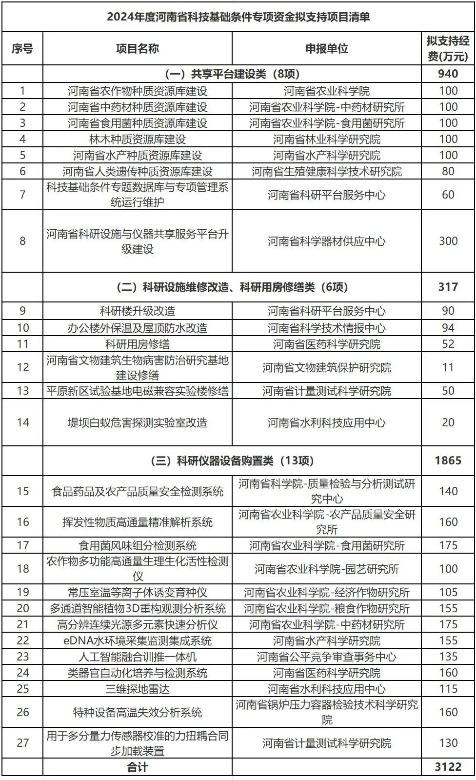 河南省科學技術廳對2025年度省科技基礎條件專項資金擬支持項目公示。擬支持項目清單含3類27個項目,擬支持經費共計3122萬元。其中,共享平臺建設類(8項)940萬元,科研設施維修改造、科研用房修繕類(6項)317萬元,科研儀器設備購置類(13項)1865萬元。