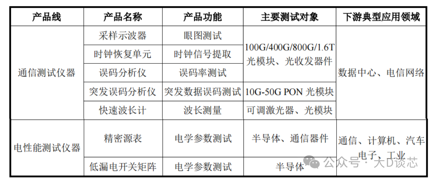公司電子測量儀器包括通信測試儀器和電性能測試儀器,通信測試儀器主要面向光通信測試,包括采樣示波器、時鐘恢復單元、誤碼分析儀等核心測試儀器;電性能測試儀器主要包括精密源表和低漏電開關矩陣,廣泛應用于通信和半導體等領域的高精度電學測試。