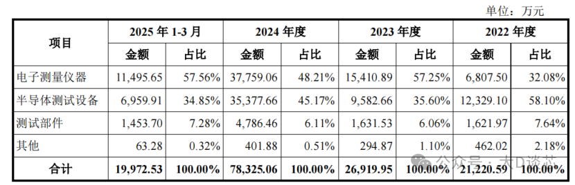 公司產品主要包括電子測量儀器和半導體測試設備,以及配套的測試部件及服務。2025年1-3月電子測量儀器的營業收入金額為11495.65萬元,占比57.56%;半導體測試設備的營業收入為6959.91萬元,占比34.85%。