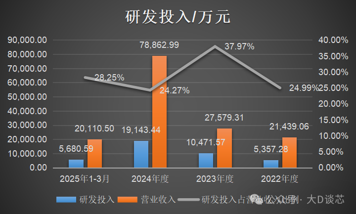 2022年至2025年3月,公司研發費用金額分別為5,357.28萬元、10,471.57萬元、19,143.44萬元和5,680.59萬元,占營業收入的比例分別為24.99%、37.97%、24.27%和28.25%,
