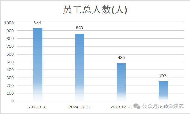 2022年至2025年3月,公司員工總人數隨著業務的發展也在不斷增加,人數分別是253、485、863和934。