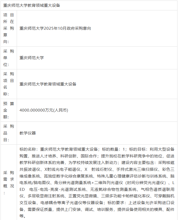 重慶師范大學(xué)2025年10月政府采購意向-重慶師范大學(xué)教育領(lǐng)域重大設(shè)備 詳細(xì)情況