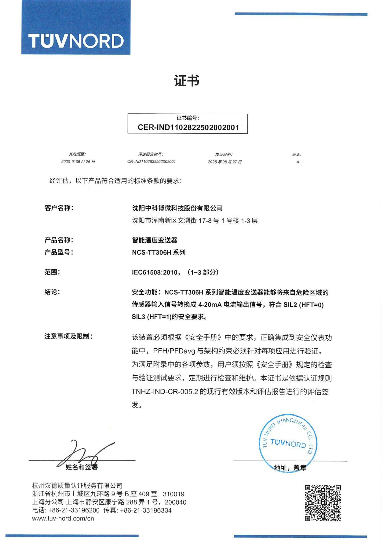 2025年8月27日,沈陽中科博微科技股份有限公司自主研發的NCS-TT306H智能溫度變送器通過TÜV測試,喜獲功能安全SIL認證權威證書。這標志著中科博微的科技創新能力及產品成果已達到國際先進、國內領先水平,為更好的開拓市場奠定了堅實的基礎。