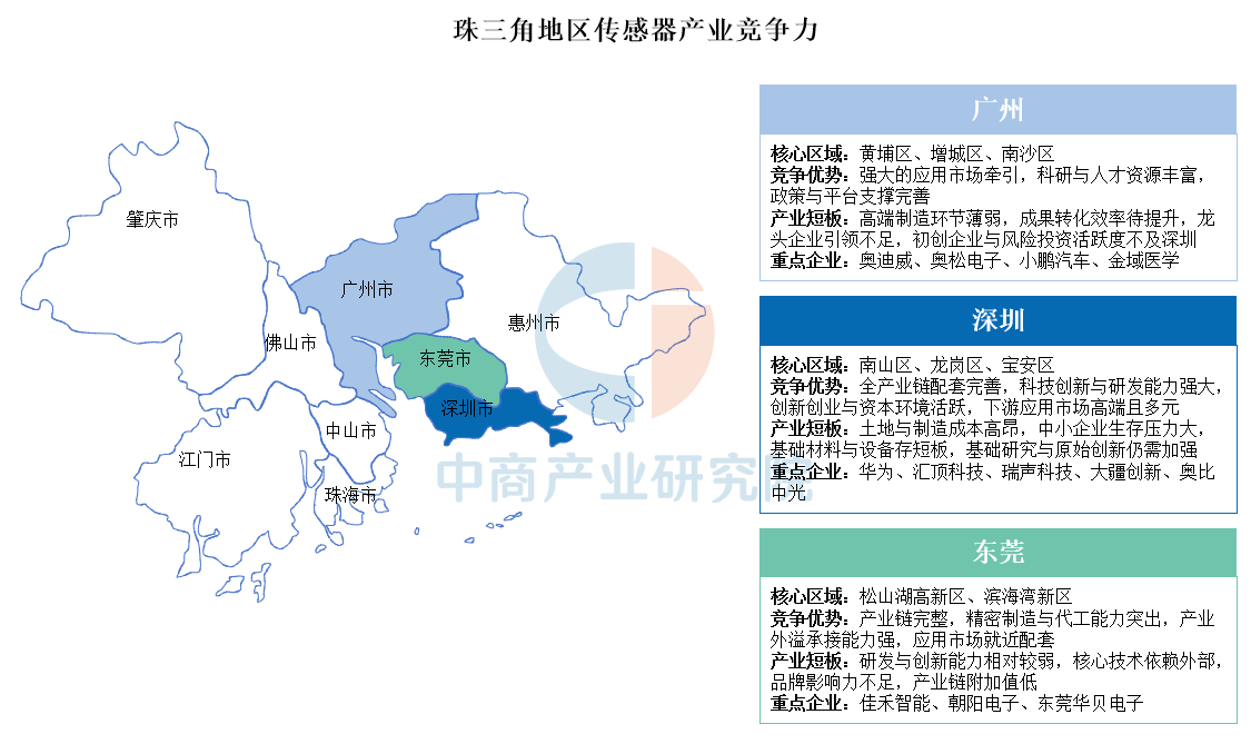 珠三角傳感器產(chǎn)業(yè)已形成廣深莞三地協(xié)同發(fā)展的格局:廣州憑借強(qiáng)大的應(yīng)用市場、科研資源與政策支持見長,但高端制造與龍頭引領(lǐng)能力不足;深圳以完善的產(chǎn)業(yè)鏈、強(qiáng)大的研發(fā)創(chuàng)新和活躍的資本環(huán)境占據(jù)高地,但面臨高成本與基礎(chǔ)研究短板;東莞則依托突出的精密制造與產(chǎn)業(yè)鏈配套能力發(fā)揮重要作用,但在研發(fā)創(chuàng)新和品牌附加值上仍有待提升。