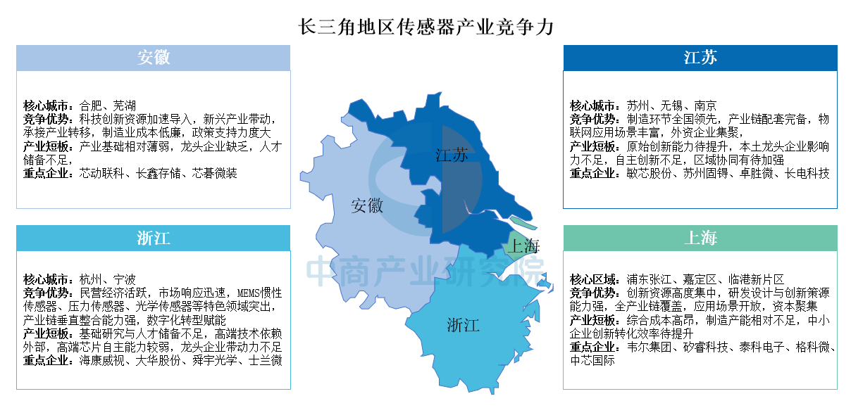 長三角地區(qū)傳感器產(chǎn)業(yè)呈現(xiàn)多層級(jí)協(xié)同發(fā)展格局:上海以研發(fā)創(chuàng)新和資本集聚見長,但面臨制造成本高企的挑戰(zhàn);浙江憑借民營經(jīng)濟(jì)活力和細(xì)分領(lǐng)域優(yōu)勢快速響應(yīng)市場,但基礎(chǔ)研究能力薄弱;江蘇強(qiáng)于制造配套和物聯(lián)網(wǎng)應(yīng)用,卻缺乏本土龍頭企業(yè)引領(lǐng);安徽依托政策紅利和成本優(yōu)勢加速產(chǎn)業(yè)承接,但產(chǎn)業(yè)基礎(chǔ)與人才儲(chǔ)備尚待夯實(shí)。