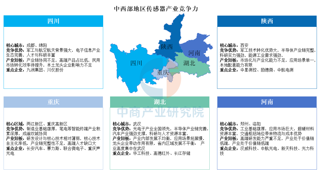 中西部地區(qū)傳感器產(chǎn)業(yè)依托傳統(tǒng)工業(yè)基礎(chǔ)與特色資源,形成多個(gè)差異化集聚區(qū)。四川依托強(qiáng)大的軍工與航空航天背景及完善的電子信息產(chǎn)業(yè)生態(tài),在傳感器領(lǐng)域具備顯著優(yōu)勢,但面臨產(chǎn)業(yè)鏈協(xié)同不足、高端產(chǎn)品占比低、民用市場轉(zhuǎn)化效率待提升及本土龍頭企業(yè)影響力較弱等問題;重慶憑借雄厚的制造業(yè)基礎(chǔ)、智能終端(如筆電)產(chǎn)業(yè)積累及成渝雙城協(xié)同優(yōu)勢出圈,但存在研發(fā)設(shè)計(jì)與核心技術(shù)薄弱、自主化率低、產(chǎn)業(yè)鏈完整性不足及高端人才缺口大等短板;湖北以光電子產(chǎn)業(yè)全國領(lǐng)先、半導(dǎo)體產(chǎn)業(yè)鏈完善及汽車產(chǎn)業(yè)強(qiáng)勁支撐為特色,但受限于產(chǎn)業(yè)內(nèi)部發(fā)展不均衡、應(yīng)用場景拓展慢、龍頭企業(yè)帶動(dòng)作用有限及省內(nèi)發(fā)展高度集中于武漢等問題;陜西突出軍工技術(shù)轉(zhuǎn)化優(yōu)勢、完整的半導(dǎo)體產(chǎn)業(yè)鏈及強(qiáng)勁的科研實(shí)力,但存在市場化與產(chǎn)業(yè)化能力不足、應(yīng)用場景單一、本地配套能力有限等短板;河南則依托工業(yè)基礎(chǔ)雄厚、應(yīng)用市場巨大、超硬材料資源豐富及交通樞紐帶來的物流成本優(yōu)勢快速發(fā)展,但受高端研發(fā)能力嚴(yán)重不足、產(chǎn)業(yè)長期處于價(jià)值鏈低端等制約。