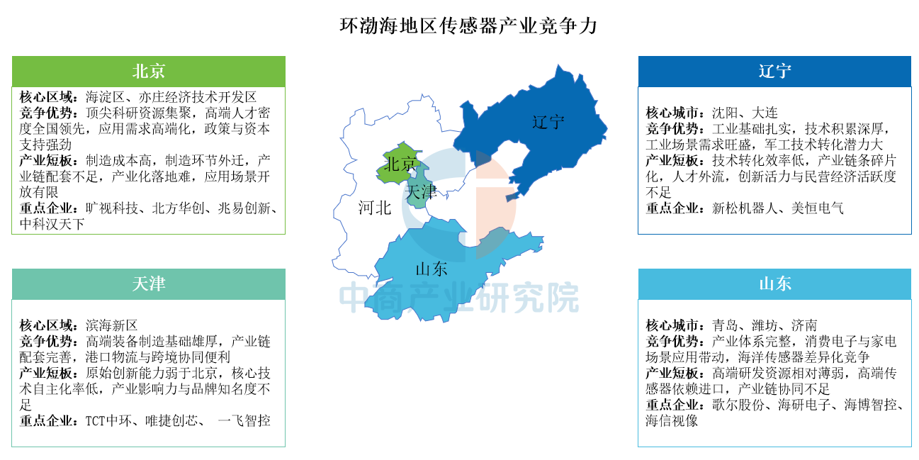 環(huán)渤海地區(qū)傳感器產(chǎn)業(yè)主要分布于北京、天津、遼寧及山東四大核心區(qū)域,各地依托差異化優(yōu)勢布局:北京以頂尖科研資源、高端人才及政策資本為支撐,但面臨制造成本高、產(chǎn)業(yè)鏈配套不足等短板;天津憑借高端裝備制造基礎(chǔ)與港口物流優(yōu)勢發(fā)展,但原始創(chuàng)新能力較弱;遼寧依托扎實(shí)工業(yè)基礎(chǔ)與軍工技術(shù)轉(zhuǎn)化潛力,存在技術(shù)轉(zhuǎn)化效率低、人才外流等問題;山東則憑借完整產(chǎn)業(yè)體系與消費(fèi)電子、海洋傳感器特色應(yīng)用場景發(fā)展,但高端研發(fā)資源薄弱且依賴進(jìn)口。