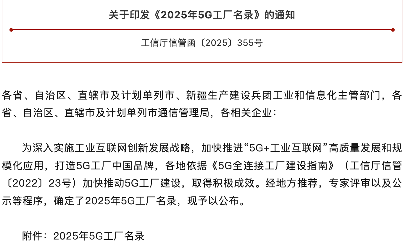 為貫徹落實工業互聯網創新發展戰略,工信部自《5G全連接工廠建設指南》發布以來,持續推動“5G工廠百千萬行動”提質升級。旨在通過打造一批高水平5G工廠,形成示范效應,加速各行各業“智改數轉網聯”進程。2025年5G工廠名錄的遴選,既是對前期建設成果的系統總結,也是為中國制造業高質量發展樹立新標桿。