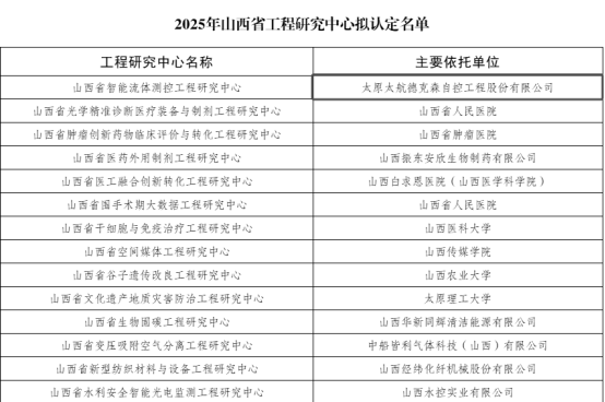 近日,山西省發展和改革委員會正式發布《關于認定2025年山西省工程研究中心的通知》(晉發改高新發〔2025〕303號)文件,由太航德克森申報的“山西省智能流體測控工程研究中心”憑借雄厚的技術實力、清晰的研發路徑與卓越的產業價值,成功入選,榮獲官方認定!