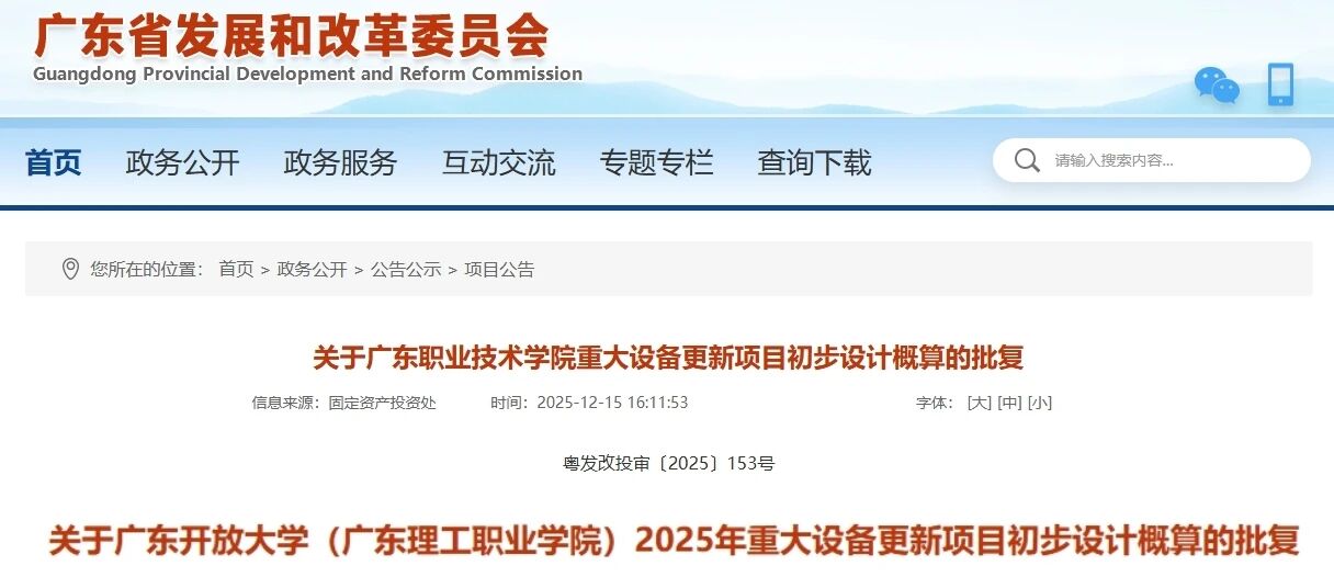 1215日,廣東省發展和改革委員會連續發布兩項批復——“關于廣東職業技術學院重大設備更新項目初步設計概算的批復”以及“關于廣東開放大學(廣東理工職業學院)2025年重大設備更新項目初步設計概算的批復”。根據批復,兩所院校擬更新購置共142臺(套)教學科研儀器設備,總投資14930萬元。