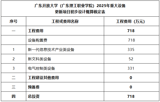 項目概算總投資718萬元,均為設備購置費。項目建設資金由學校申請超長期特別國債及自籌解決。
