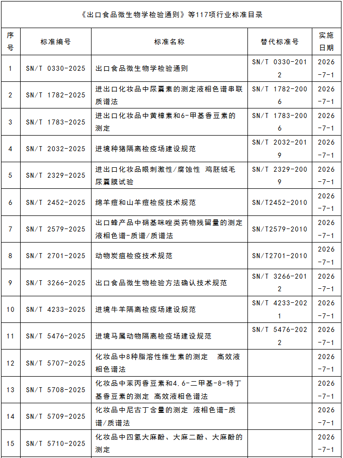 1211日,海關總署發(fā)布《出口食品微生物學檢驗通則》等117項行業(yè)標準。這些新發(fā)布的行業(yè)標準旨在進一步規(guī)范出口食品的檢驗流程,確保出口食品的質量與安全,提升我國食品在國際市場上的競爭力。