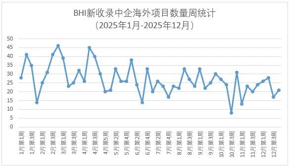 據(jù)BHI中企海外項目數(shù)據(jù)庫監(jiān)測,上周(1222-26日)BHI新收錄中企新簽約/中標(biāo)/公告海外項目21個,較此前小幅回升。其中中國交建7個項目、中國能建6個項目。2025年新收錄項目超過1340個。近一年每周新收錄項目數(shù)量趨勢統(tǒng)計詳見下圖。