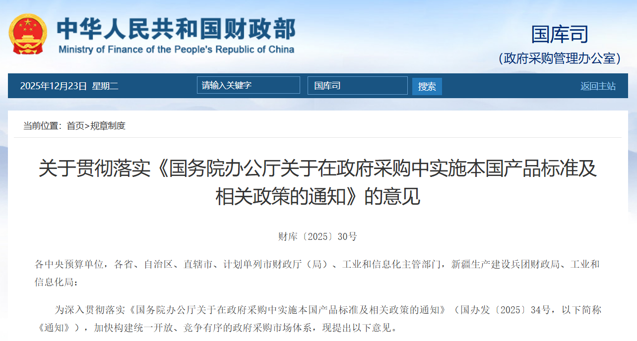 為深入貫徹落實(shí)《國務(wù)院辦公廳關(guān)于在政府采購中實(shí)施本國產(chǎn)品標(biāo)準(zhǔn)及相關(guān)政策的通知》(國辦發(fā)〔2025〕34號,以下簡稱《通知》),加快構(gòu)建統(tǒng)一開放、競爭有序的政府采購市場體系,現(xiàn)提出以下意見。
