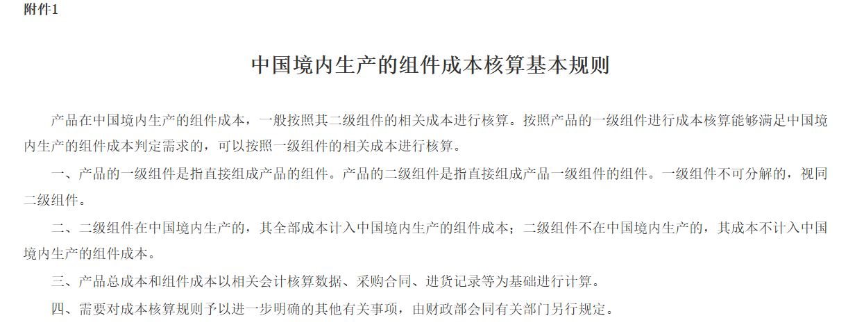 (二)在中國境內(nèi)生產(chǎn)的組件成本占比達(dá)到規(guī)定比例
