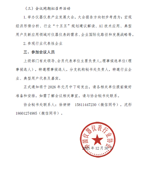 根據《中國儀器儀表行業協會章程》規定,經中國儀器儀表行業協會(以下簡稱協會)換屆工作領導小組研究決定,定于2026 38-10 日召開協會第九屆會員代表大會。現將會議有關事項預通知如下:
