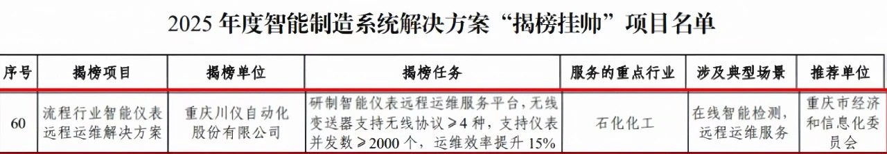 重慶川儀自動化股份有限公司(以下簡稱“川儀股份”)“流程行業(yè)智能儀表遠程運維解決方案”成功上榜工信部2025年度智能制造系統(tǒng)解決方案“揭榜掛帥”項目名單。