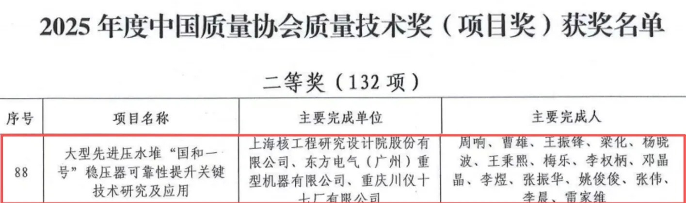 重慶川儀十七廠有限公司(以下簡稱“川儀十七廠”)與上海核工程研究設(shè)計院股份有限公司、東方電氣(廣州)重型機器有限公司聯(lián)合攻關(guān)的“大型先進壓水堆‘國和一號’穩(wěn)壓器可靠性提升關(guān)鍵技術(shù)研究及應(yīng)用”項目,榮獲2025年中國質(zhì)量協(xié)會“質(zhì)量技術(shù)獎”二等獎。