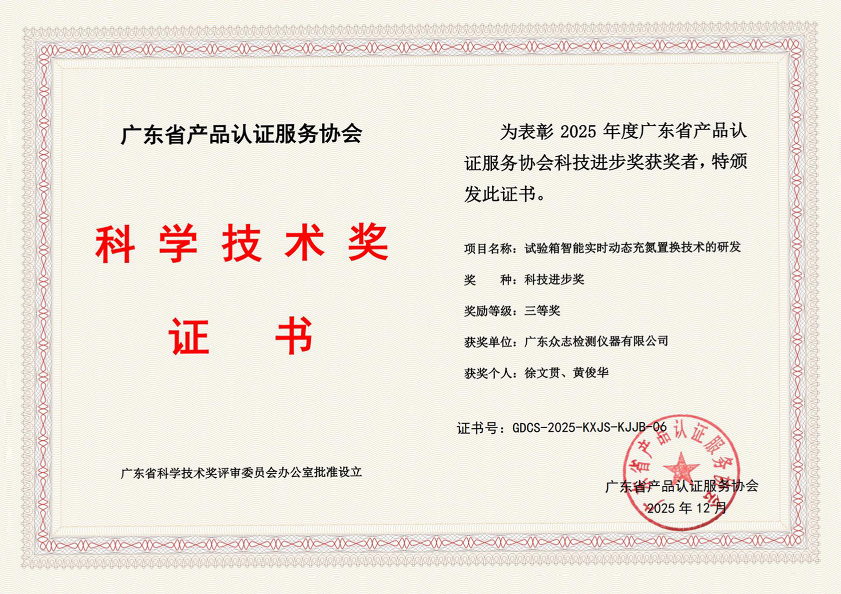 近日,廣東省產品認證服務協會正式公布了2025年度科學技術獎(科技進步獎)獲獎名單。廣東眾志檢測儀器有限公司憑借“試驗箱智能實時動態(tài)充氮置換技術的研發(fā)”項目,榮獲科技進步獎三等獎。這一榮譽不僅是對企業(yè)技術實力的認可,更是對其在半導體核心裝備國產化進程中突出貢獻的充分肯定。