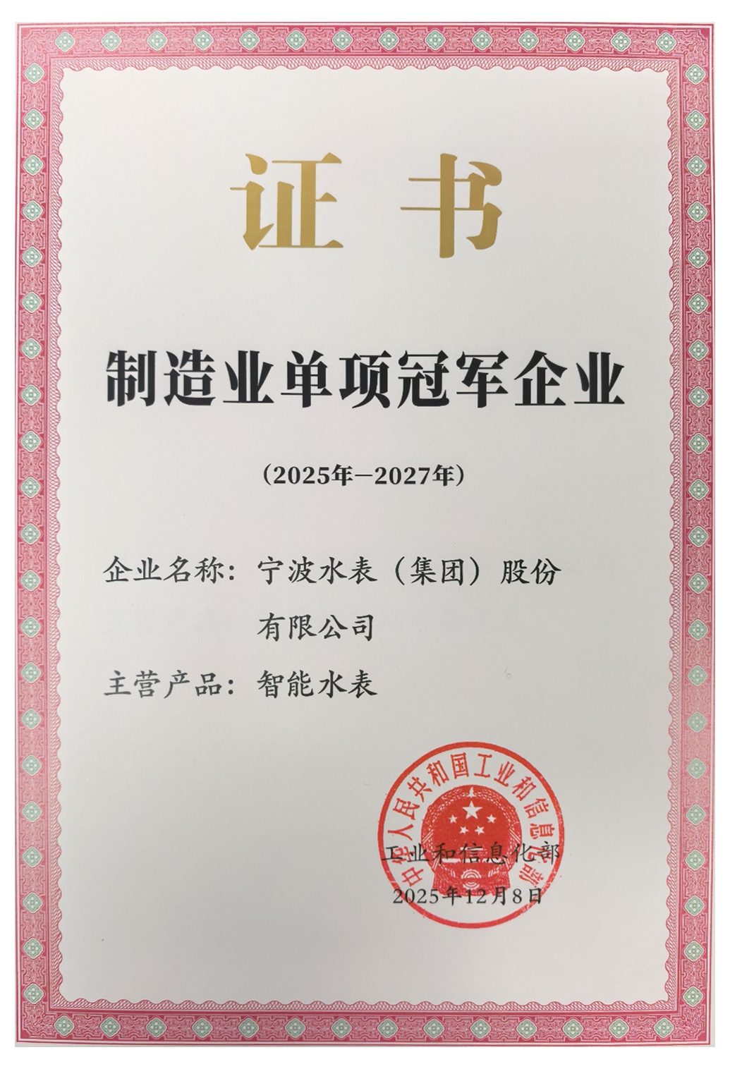 近日,工業(yè)和信息化部正式公布制造業(yè)單項(xiàng)冠軍企業(yè)復(fù)核通過名單,寧波水表(集團(tuán))股份有限公司(以下簡稱“寧水集團(tuán)”)再次榮膺國家級(jí)制造業(yè)單項(xiàng)冠軍企業(yè)稱號(hào),成為行業(yè)內(nèi)唯一蟬聯(lián)該國家級(jí)榮譽(yù)的標(biāo)桿企業(yè)。此次復(fù)核成功,不僅是對(duì)寧水集團(tuán)在智能水計(jì)量領(lǐng)域全球領(lǐng)先地位的權(quán)威認(rèn)證,更是對(duì)企業(yè)構(gòu)建并持續(xù)深化技術(shù)、制造與品牌全方位核心競爭力的國家級(jí)認(rèn)可。